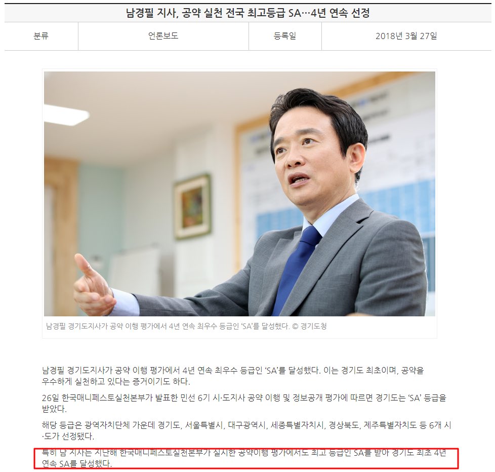 남경필, 공약 실천 전국 최고등급 SA, 경기도 최초 4년 연속 달성;;