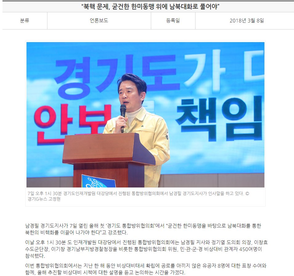 남경필, 북핵 문제 굳건한 한미동맹을 바탕으로 남북대화로 북한의 비핵화 이끌어야 (2018.3.8)