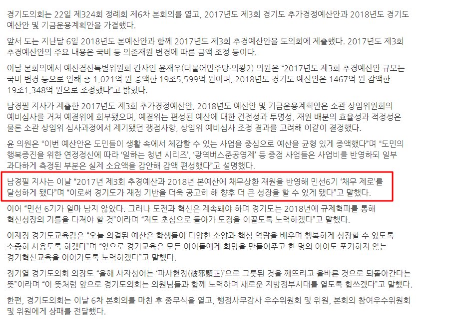 남경필, "2017년 추경예산과 2018 본예산에 채무상환 재원 반영해 민선6기 '채무 제로'를 달성하게 되었다"