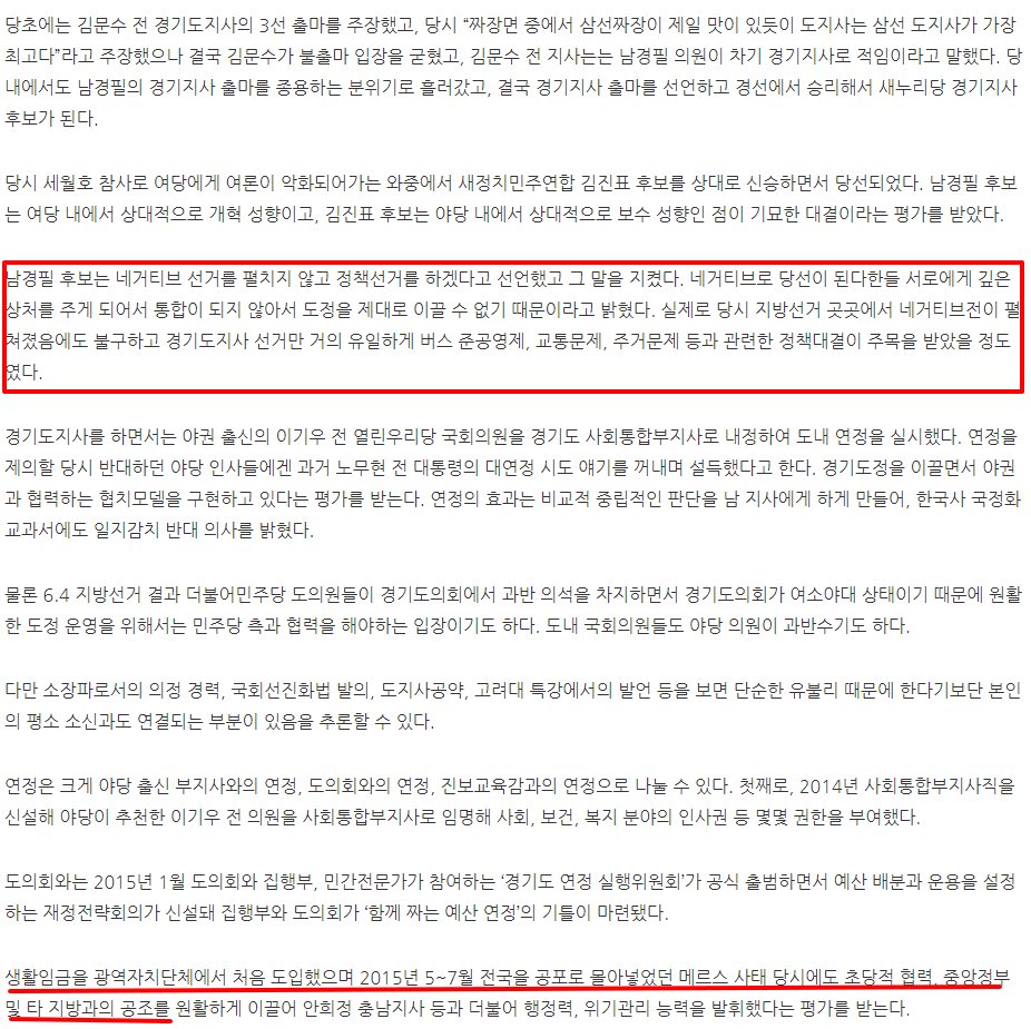지난 지선에서 '남경필 후보는 네거티브 선거를 펼치지 않고 정책선거를 하겠다고 선언했고 그 말을 지켰다. 네거티브로 당선이 된다한들 서로에게 깊은 상처를 주게 되어서 통합이 되지 않아서 도정을 제대로 이끌 수 없기 때문"