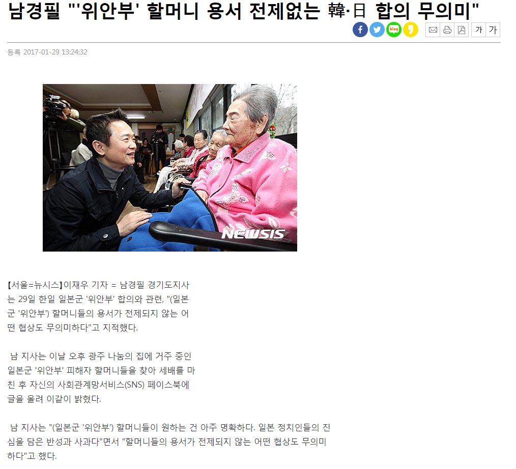 17.1.29 남경필 '위안부' 합의와 관련, 할머니들의 용서가 전제되지 않는 어떤 협상도 무의미, 할머니들이 원하는 건 일본 정치인들의 진심을 담은 반성과 사과"