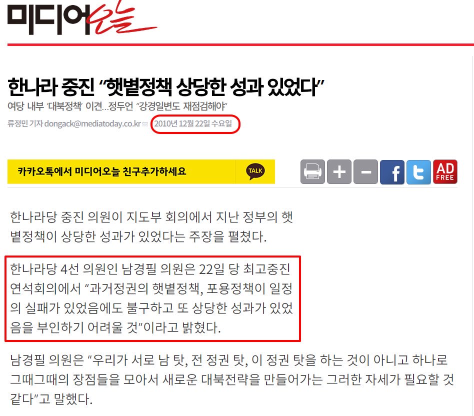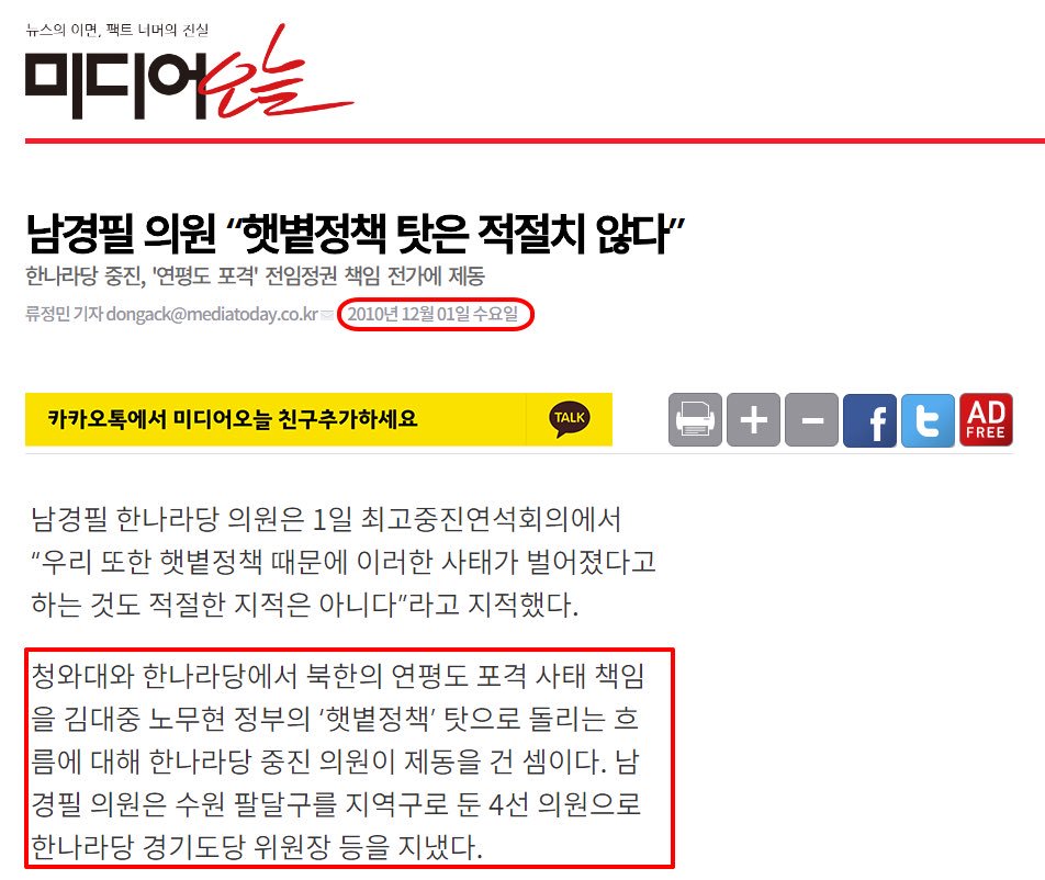 “우리 또한 햇볕정책 때문에 연평도 포격 벌어졌다고 하는 것도 적절한 지적은 아니다. " 북한의 연평도 포격 사태 책임을 김대중 노무현 정부의 ‘햇볕정책’ 탓으로 돌리는 흐름에 대해 한나라당 중진 의원이 제동을 건 셈이다.