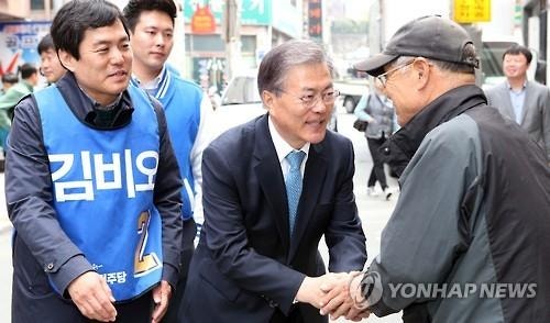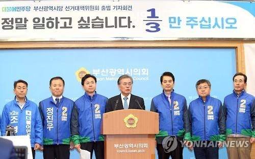 (서울·부산=연합뉴스) 박창수 류지복 기자 = 더불어민주당 문재인 전 대표는 31일 "우리 자체 조사에 의하면 적어도 (부산에서) 5명 정도는 당선 가능권에 들어와 있다"며 현행 여론조사 방식에 강한 불만을 표시한 뒤 유선전화 여론조사를 금지해야 한다고 주장했다.